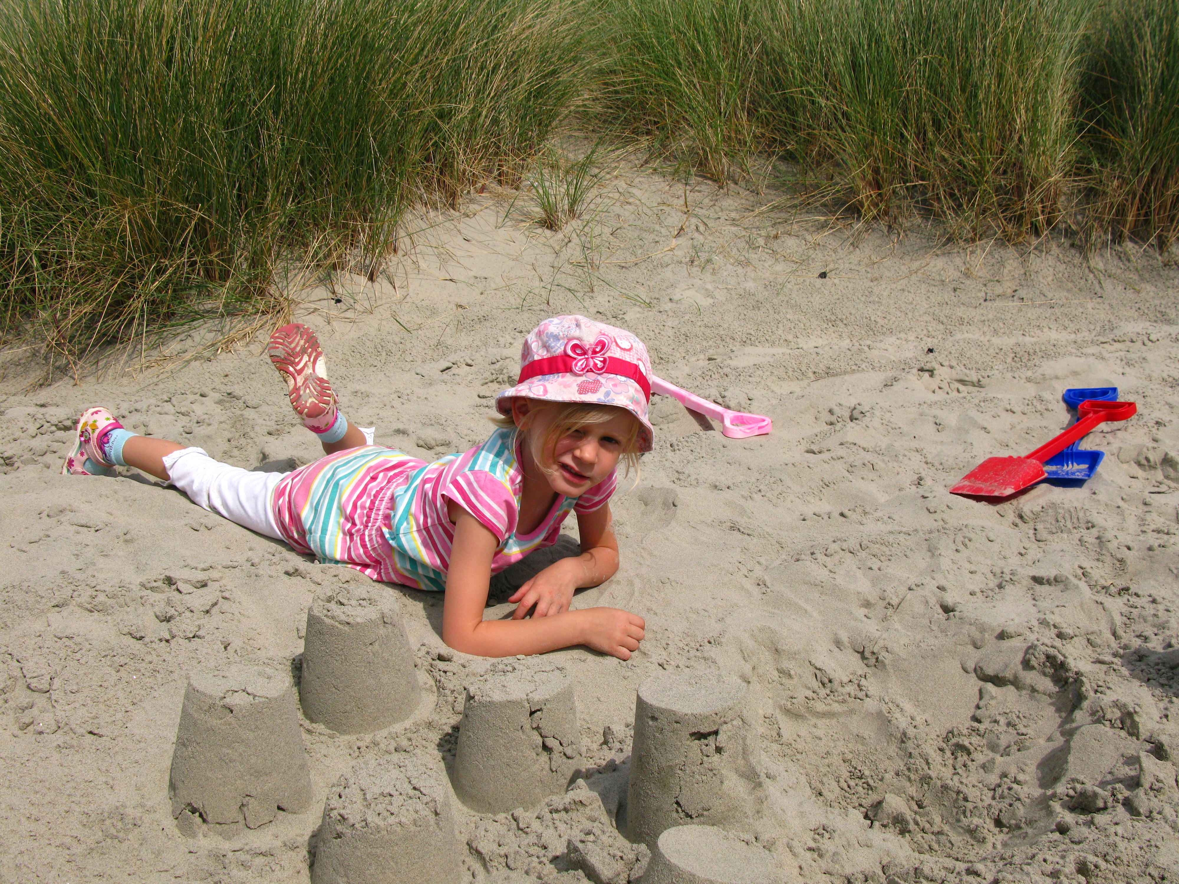 We also had a visit to London (picture of me with the Critter and my niece), went crabbing and had some fun making sand-castles in the dunes (the observant viewer will notice that it has by now stopped raining – this merely reflects the fact that this was our last week in Blighty, so obviously the sun came out and apparently shone for a good couple of weeks after we left…!)