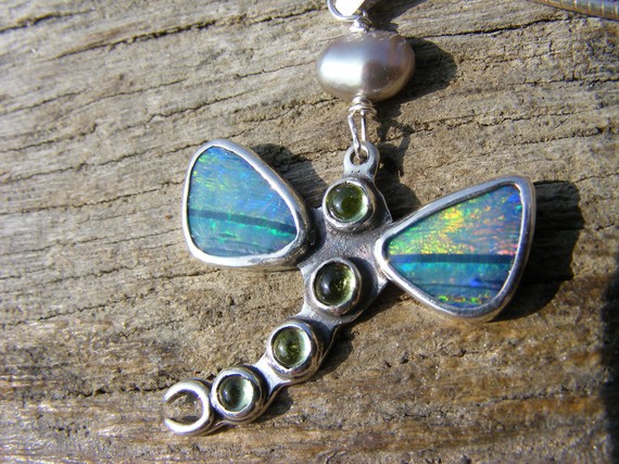 Recently purchased; this beautiful dragonfly pendant made by the talented Julia Quinn at Cheeky Lemur . The wings are of opal and the body is set with peridots, and it is such an eye-catching, unusual piece. I bought this pendant for my sister-in-law as she is fond of butterflies and dragonflies and other such winged creatures, plus her birthday is in August and peridots are the birthstone for August, so it was just perfect. I have now sent the pendant, having spent a couple of weeks gazing covetously at it and wishing I could keep it! Julia lives in Normandy and says that she derives inspiration from the lush natural landscape that surrounds her, and I can imagine this creature hovering across a lake or perching on a strand of long grass.