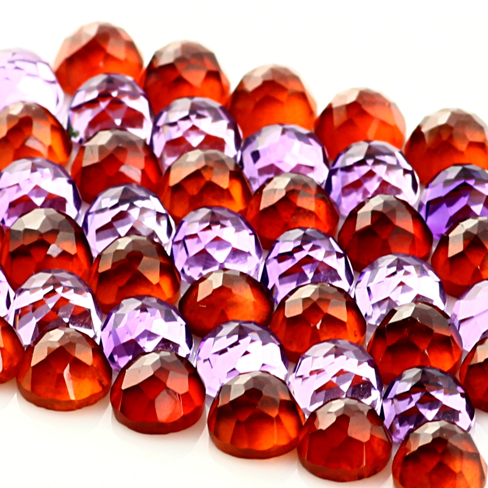 Purple and orange is an obvious one, I guess, like a sunset; the colours a bold pairing that would work year round – intense and Mediterranean in the summer, and cosy and rich in the winter. I don’t know if I’d be brave enough to wear it in an outfit, but jewellery, yes definitely. Above is hessonite garnet 6mm rose cut round and Brazilian amethyst 6mm rose cut round.