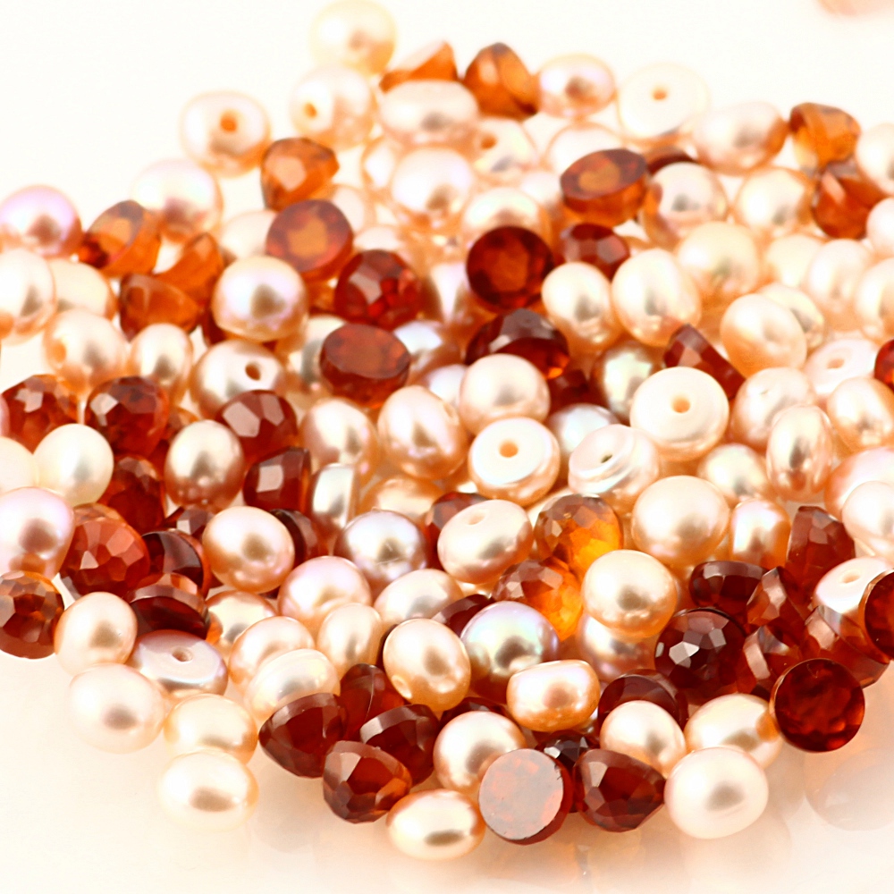 Finally, this shade of burnt orange is just the kind of colour that will work really well with neutrals. I tried it with some pearls; left we have hessonite garnet 4mm rose cut round cabochons with white freshwater pearls, 4-5mm half drilled buttons. Warm, subtle and sophisticated, this is an elegant combination that will look great with summer neutrals; ivory, cream and beige linens and so on. Again I can see it working across seasons, adding a warmth and glow in the colder months. I love the combination of textures and the way the light plays off them; the lustre of the pearls and the sharp, faceted edges of the hessonite.
