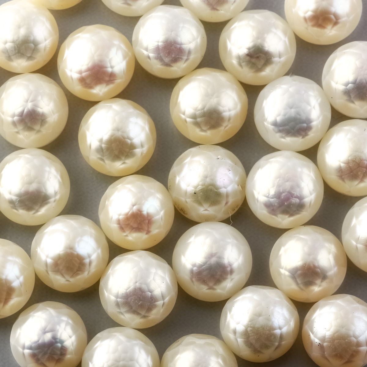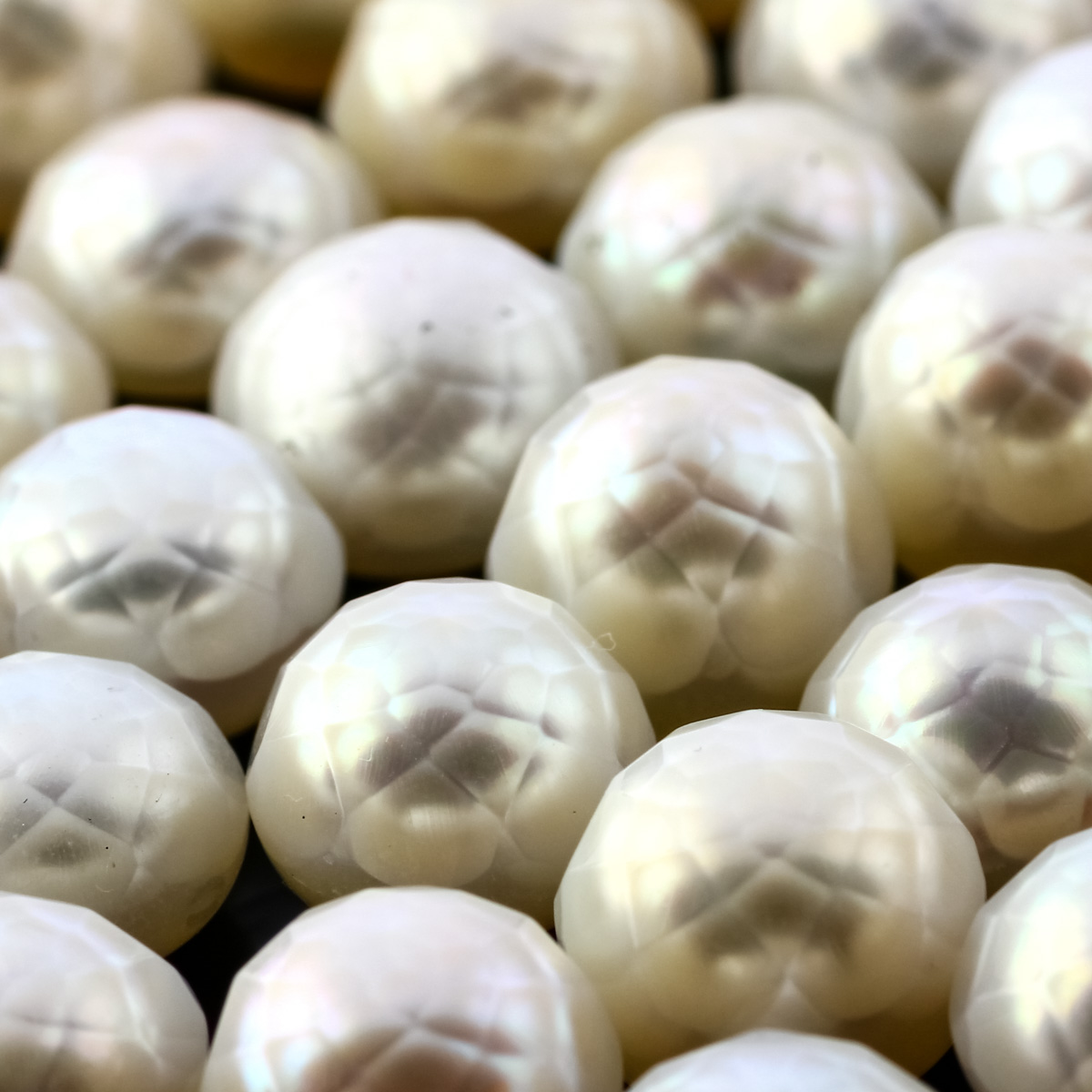 I do love classic pearls. They are beautiful and glowing, and flattering. However I am also really excited when I see pearls that are a bit different. That’s either in the style of pearl – for instance I love anything keshi or baroque – or in what has been done to the pearl. Because yes, sacre bleu! Sometimes pearls are cut, faceted or drilled to make something entirely unexpected. I became interested in this a couple of years back when I wondered if it were possible to facet pearls so that they could be rose cut (since I specialise in rose cuts). We had a go and the results, in my view, were awesome. I have these in a variety of sizes and you can find them in my pearls section here.