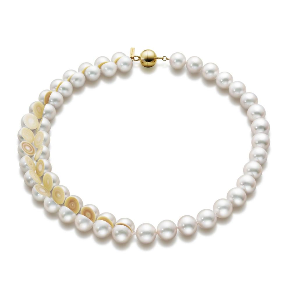 I’m not the only one; two designers that work with pearls in this way are Melanie Georgacopoulos and Motley. When I first saw Melanie Georgacopoulos’ (in her collaboration with Tasaki as the M/G Tasaki brand) sliced pearl necklace I was blown away. I just hadn’t seen anything as different and exciting as this in a long time. I love the way that you can see the concentric rings of nacre throughout the pearls. Just stunning.