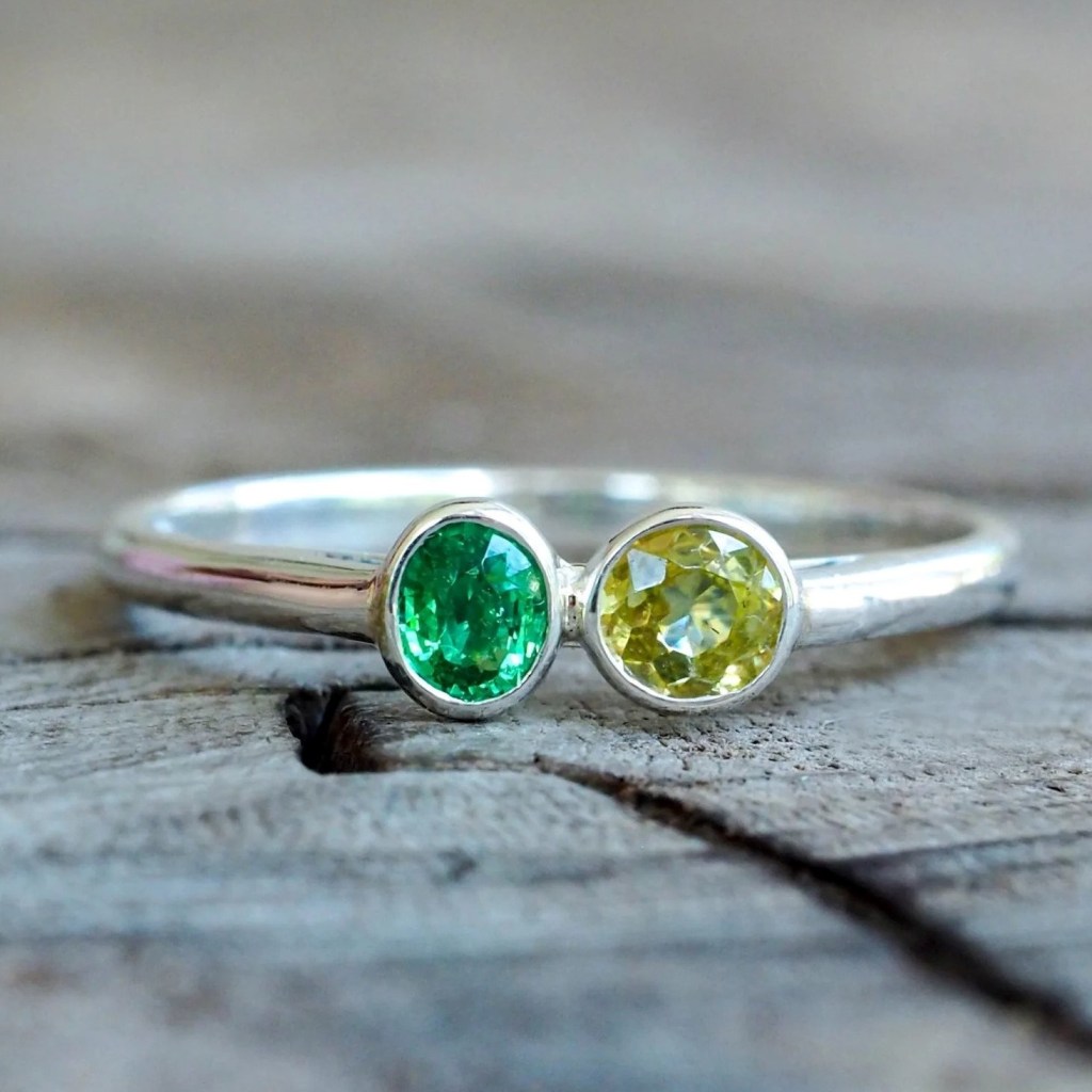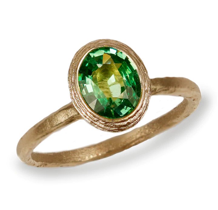 In my view, the best option. Like tourmaline, garnet comes in an array of colours, although it’s possible that this is not quite so well known. For many, garnet refers to the dark and dusty jewellery belonging to your grandmother. The green versions of garnet are tsavorite and demantoid, and the most appropriate of these as an emerald alternative is tsavorite. It’s not the cheapest, but it’s vibrant green, it’s not hard to find in clean quality and as it is garnet, it also has great brilliance and fire. Yes, fire. Garnet is often so dark that you can’t see this, but with tsavorite you often can. Its colour is caused by the element vanadium, like emerald, and indeed the colour can often rival that of emerald. It’s one of my favourite stones and at 7-7.5 on the Mohs scale it can make a ring stone. You can see how beautiful it is both in the larger rings stone below left and in smaller stones on the right.