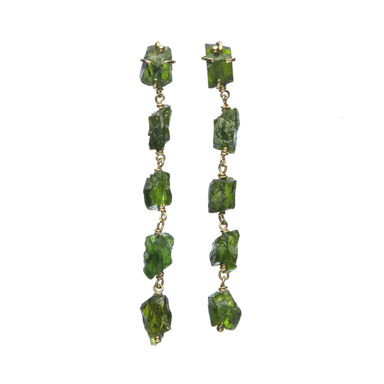 Tourmaline comes in a dazzling array of colours, which makes it an excellent option. Although some green tourmaline shades quite yellow, the brighter grass greens are lively enough to make an excellent alternative. High quality chrome tourmaline certainly can rival emerald and tsavorite. Highly regarded as a stone in its own right, it is coloured by the elements iron and possibly titanium, and the brightest green stones contain traces of chromium and vanadium, like emerald. Measuring 7-7.5 on the Mohs scale, it’s the hardest so far of our potential substitutes and can be used with care in rings. Bot of the earrings below demonstrate the colour shade range that tourmaline can display and I love the arrangement of the different colours.