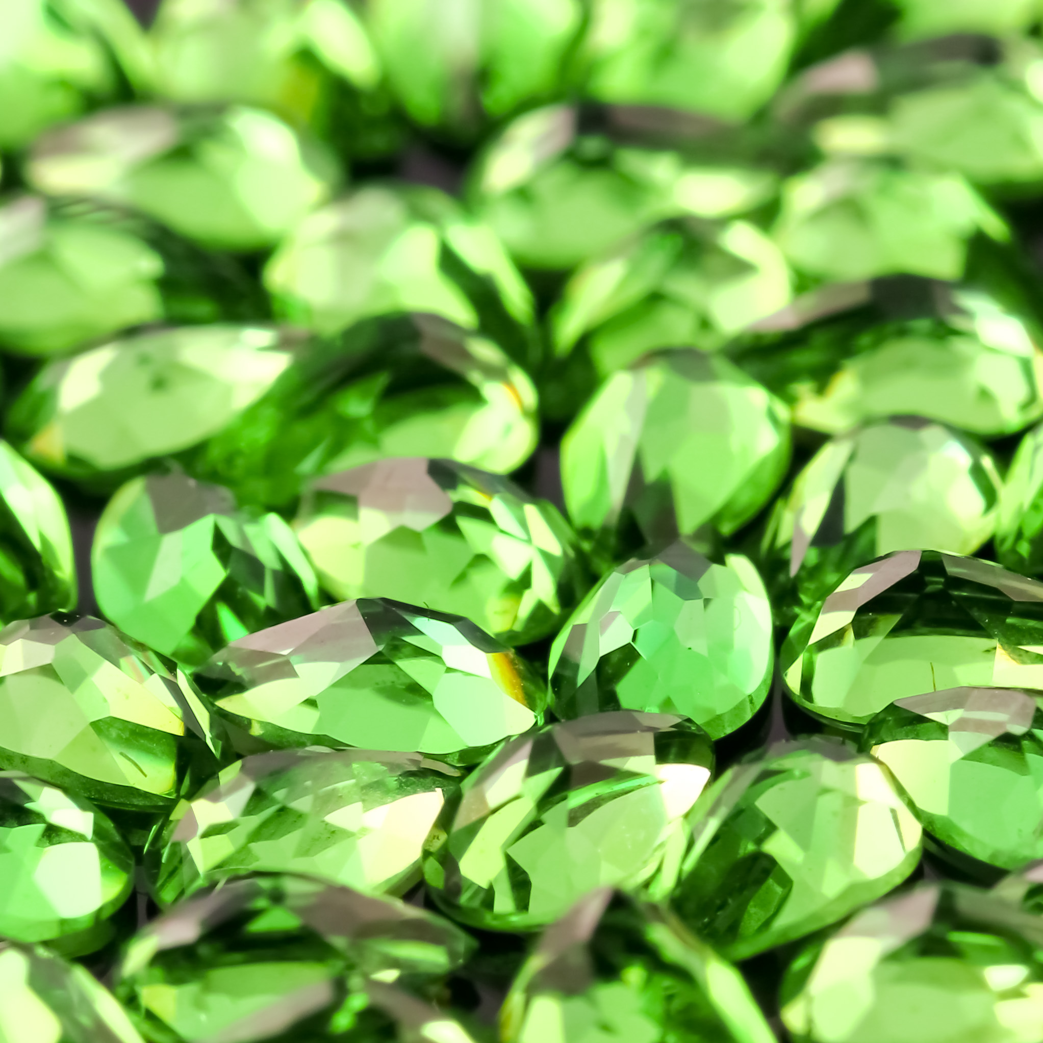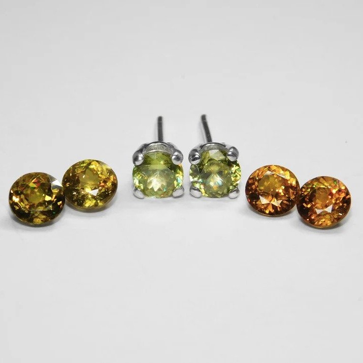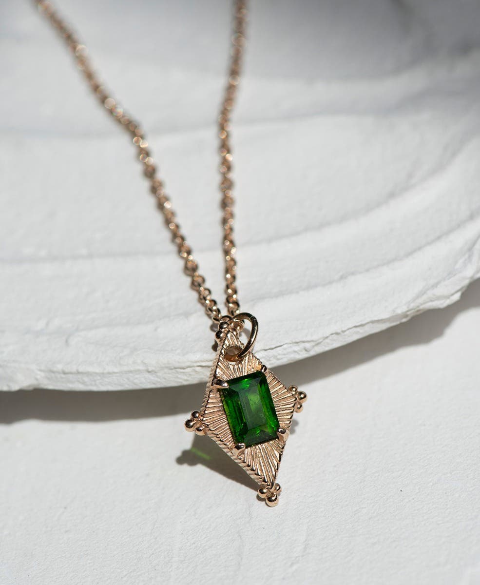 This is an excellent choice as it is a stone that is not routinely treated and tends to display much better clarity than emerald. A fantastic, saturated green with great sparkle, it is coloured by the same elements as emerald; chromium or vanadium. In some cases this may be too good, as it tends to look dark in larger sizes; it needs careful cutting to maintain a good, open colour. The flip side of this means that it retains good saturation even in small sizes. It is pretty soft – 5.5-6 on the Mohs scale and so is not really tough enough to make a good ring stone. This also means that facet edges will abrade over time. Below you can really see the density of colour even in the tiny studs on Isueszabo’s stud earrings.