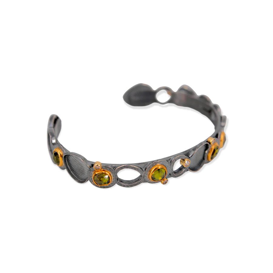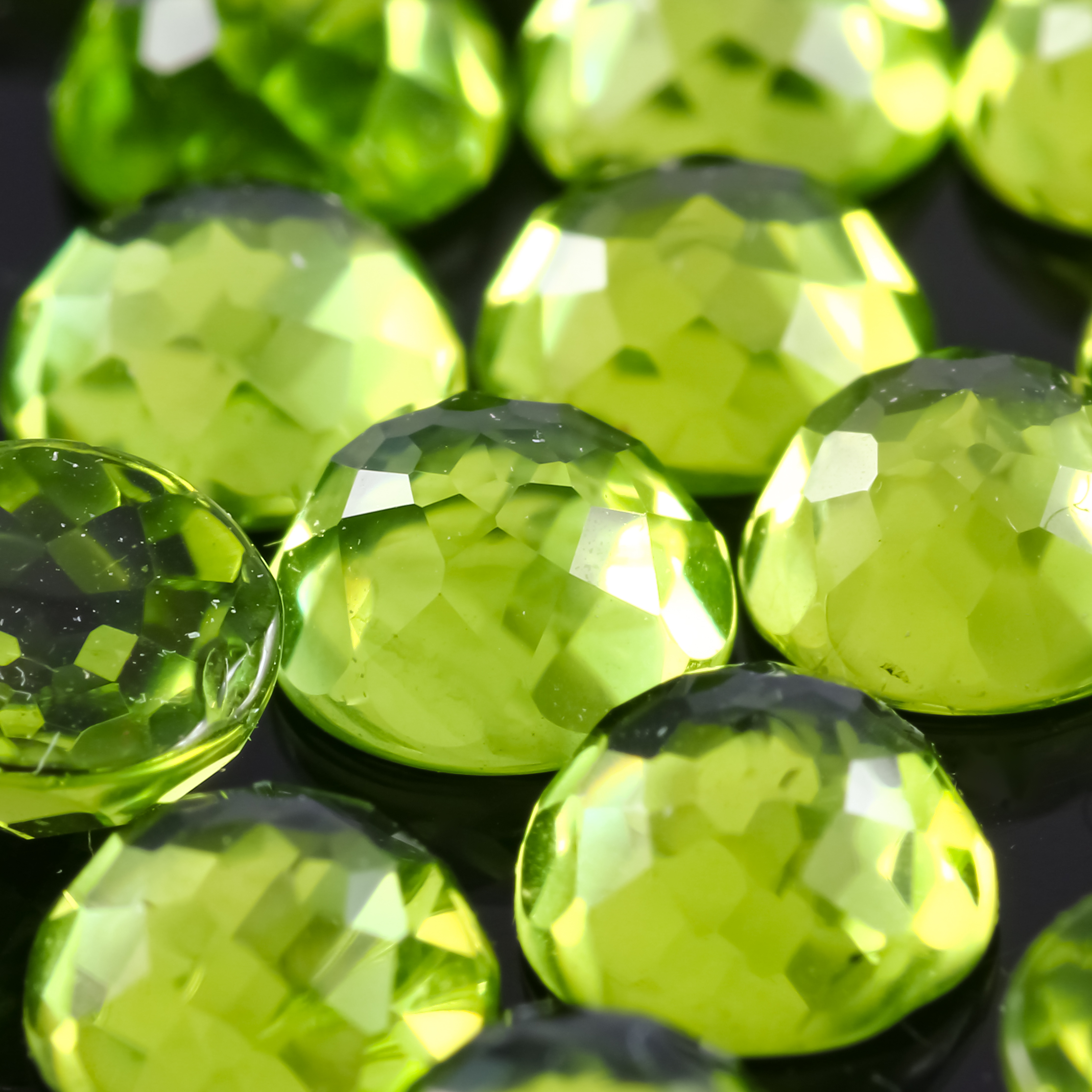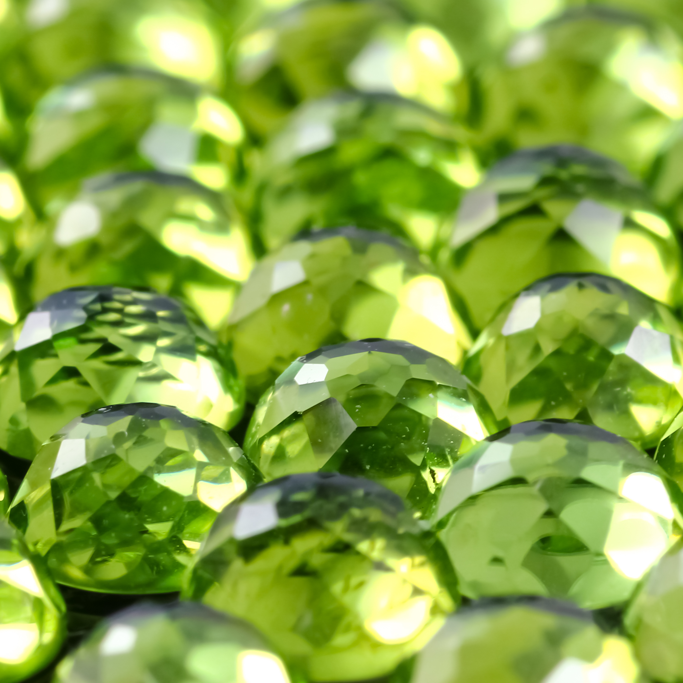 It’s a bit too yellow to be a particularly convincing substitute, and it can have a bit of an oily lustre but it is the most affordable untreated green gem, and it has in the past been mistaken for emerald. It is speculated that Cleopatra’s famous emerald collection was in fact peridot. It isn’t particularly difficult to find clean quality up to around 6mm; after that it gets a bit harder to find clean quality and whilst its characteristic lily-pad inclusions are rather beautiful, you also often get small, black mineral inclusions which are less appealing. I have clean quality up to 6mm but my 8mm stones are sprinkled with these tiny black inclusions. It is possible to get clean quality at this size, but expect to pay around 5 times the price. Peridot looks particularly beautiful with gold, which draws out the warm, gold tones. It isn’t, however, a great ring stone as it is rather soft – 6.5-7 on the Mohs scale – and it doesn’t take much for facet edges to become abraded. It’s iron that causes its attractive yellowish-green tones and most of it comes from China and Arizona in the USA. You have to be a bit careful with it – plunging in cold water after soldering can crack it and ultrasonic cleaning can wreck it. Below you can see how the warm gold of the setting picks up and complements the warmth of the stones.