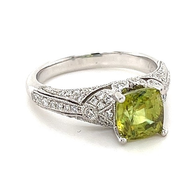 If you think that sphene makes you sound like you have a speech impediment, you can always go for its alternative name: titanite. Either way there’s a good chance that you have never heard of this incredibly beautiful, unusual and lively stone. Sphene has more fire than a diamond; its dispersion – that is, its ability to separate white light into the colours of the spectrum – is higher than a diamond. This fire is obvious to the naked eye and is even more extreme under incandescent light. It is hard to describe the colour of this stone as it has strong pleochroism and will change colour according to the angle it’s being viewed but think autumn leaves, many-coloured and flashed through with oranges and yellows. Most sought after is a bright, chrome green. It’s hard to find it completely clean; it normally will have needles, mistiness and veils but this in no way detracts from the beauty of this most unusual stone. It’s soft – 5-5.5 Mohs, which means really it’s best for necklaces and earrings, maybe you could get away with an occasional use ring, especially if it’s in a protected setting, but do give it a go, you’ll be amazed.