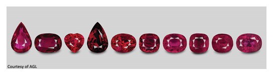 The problem is, this is by no means straightforward. Over the years, trade and commercial names have arisen to describe top colour. Most of these will have their roots in something quite meaningful and specific, but because the names themselves are not specific, it gives sellers a great deal of leeway to include a huge variety of shades until the name becomes practically meaningless. Ruby is a really good example; the term ‘pigeons’ blood’ has for years been the gold standard in terms of colour. It’s meant to refer to stones with a glowing red fluorescence, but just look at the shade range as illustrated in this AGL photograph. A 2015 study examined 500 rubies on just one trading network with 90% described as ‘pigeons’ blood’. But with per carat prices ranging from $450 to $50,000, the description is meaningless. In fact the term that the GIA use is ‘fanciful’.