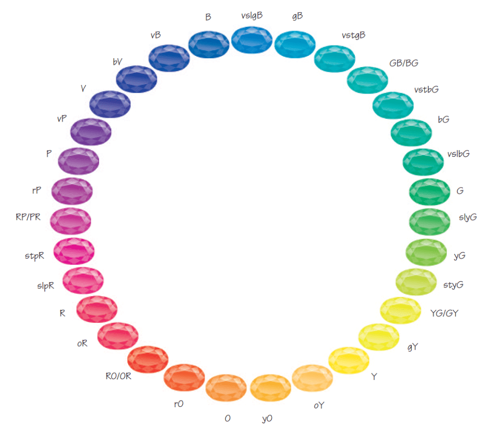 The GIA has long sought to take the flights of fancy out of colour description and has developed a system of colour classification that relies on extremely fine shade distinction and a very objective language: for example, colours run from, say, very strong blue-green to blue green, to very slightly blue-green, to green, and so on. These colour definitions allow a really accurate description and are anchored to a colour chart (see below, courtesy of GIA). What this method lacks in romance it does make up for in accuracy and it does something else as well; it restricts the colour solely to a gemstone’s hue.