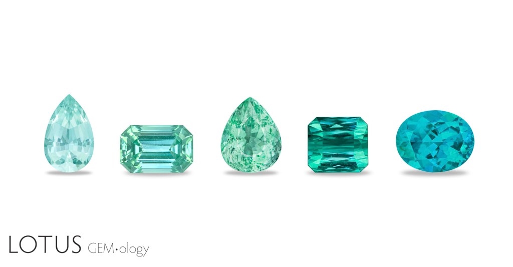 Paraiba tourmaline is another example. Coloured by copper, these stones are extraordinary, neon aqua stones (sometimes described as ‘Windex’!). They were discovered relatively recently, in 1982 and found only in Brazil, named for the province where they were found. Whilst subsequent deposits of copper bearing ore was found in Mozambique and Nigeria, most stones did not approach the extraordinary saturation and hue of the Brazilian stones. But have a little look on ebay; go on, put ‘paraiba tourmaline’ into the search box and what comes up is anything with the slightest aqua hue, from watery pale greens and light blues. In the picture below (courtesy of Lotus Gemology), from left to right, all of these would appear to qualify as paraiba, but only two of them owe their colour primarily to copper (stones 3 and 5 working from left to right). They appear almost identical and all equally breathtaking, but the term Pariaba will cause the price to skyrocket.
