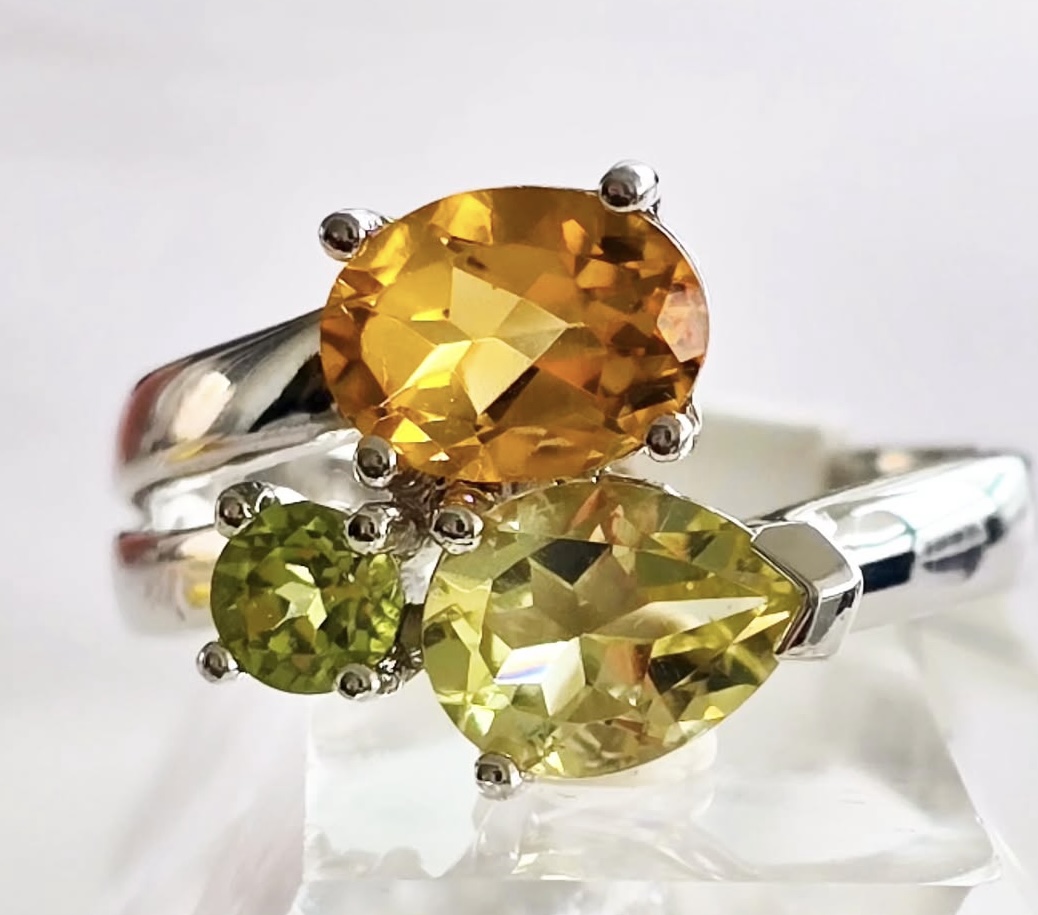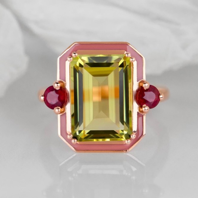 Quartz is one of the most ubiquitous gemstones; whether amethyst, citrine, rose, smoky or lemon, it’s plentiful and reasonably priced and you’re not going to have to part with a limb to buy it. It comes in so many different colours, including the fascinating and beautiful rutilated varieties. I want to talk a bit about lemon quartz, as it’s one of the family of treated quartzes and is a bit of an unsung hero. It’s a stone that cuts and polishes nicely and you can have it in pretty large sizes due to the relatively low carat price. Whiskey quartz, lemon quartz; nice lustrous stones in good sizes. Lemon quartz is irradiated with cobalt 60 gamma rays at very low dose (the stones aren’t glowing!) and then heated. The other thing that people aren’t generally aware of is that comes in different intensities of colour – and I don’t just mean that bigger stones are more saturated; you can get it from pale to much more intense yellow-green. My supplier tells me that people use it as a substitute for peridot, but I don’t think it’s that dark. It is on the same fresh, citric yellow-green spectrum, however. I used to sell mine – which is darker than standard lemon quartz – as green-gold quartz, to differentiate it, but it was too much of a differentiation, as people didn’t know what I was talking about and after I got asked a few times if I stocked lemon quartz, just changed the title! But it does have good saturation and is more of a yellow-green than pale yellow; I think you need it with a bit of saturation otherwise it looks a bit wan. The colour is more like a chrysoberyl and I think it really comes into its own when it’s mixed with other gemstones. I love the combination with citrine, which you would think would be a clash; the warm gold and the cool lemon, but it works. I also absolutely love it with the ruby, and I never would have thought about pairing these two, but they look amazing. In fact, I think I do like this stone best when it’s warmed up with gold, or golden stones, as they just seem to make it glow.