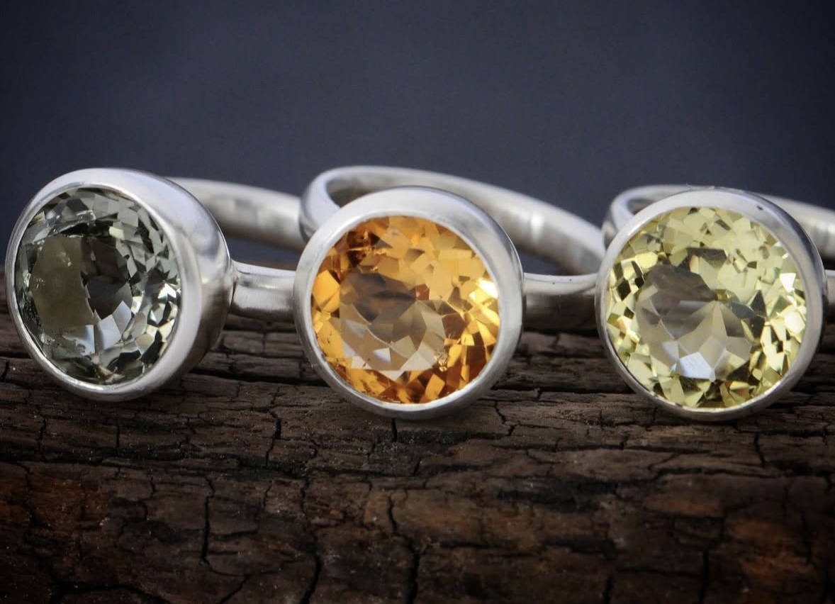 At the more inexpensive range there is lemon quartz with a cool, greenish overtone. This is a great stone for having cut in large sizes as it isn’t hard to find clean specimens and the carat price is reasonable even for large stones. Citrine runs from pale straw through to a deep almost orange-yellow and I think looks awesome with white metals. Golden rutilated quartz would often work, and these stones can be real showstoppers. More unusual stones might be tourmaline which again will come in any shade from pale yellow to deep gold, yellow beryl, which is often quite light or chrysoberyl. I have introduced some yellow diamond rose cuts in my shop; clean yellow diamond is very expensive but the included variety still offers plenty of glitter without making a hole in your pocket.