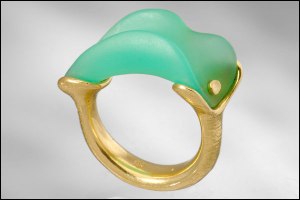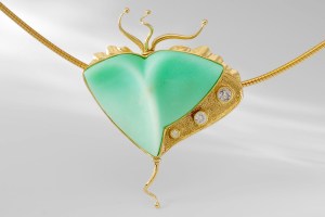 This will substitute for translucent emerald – the kind you often see in polki cuts and beads. The kind of emerald that is used for this is often very included and often has those blackish inclusions. The colour and lustre can be poor, so lovely chrysoprase can be a good option if you want a brighter colour and cleaner look. Chrysoprase means ‘golden apple’ in Greek, and indeed, its best colour is a zingy apple green with just a touch of yellow. This stone is coloured by nickel and makes fantastic earrings. Again, it is really complemented by yellow metal settings but it is also quite soft – 6-7 on the Mohs scale, so is best suited to earrings or pendants that don’t get a lot of rough treatment. These two earrings below are a perfect example of the kind of clean, opaque material with that lovely emerald-like blue-green shade.