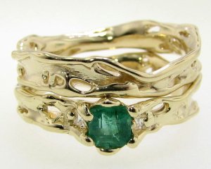 It’s a bit too yellow to be a particularly convincing substitute, and it can have a bit of an oily lustre but it is the most affordable untreated green gem, and it has in the past been mistaken for emerald. It is speculated that Cleopatra’s famous emerald collection was in fact peridot. It isn’t particularly difficult to find clean quality up to around 6mm; after that it gets a bit harder to find clean quality and whilst its characteristic lily-pad inclusions are rather beautiful, you also often get small, black mineral inclusions which are less appealing. I have clean quality up to 6mm but my 8mm stones are sprinkled with these tiny black inclusions. It is possible to get clean quality at this size, but expect to pay around 5 times the price. Peridot looks particularly beautiful with gold, which draws out the warm, gold tones. It isn’t, however, a great ring stone as it is rather soft – 6.5-7 on the Mohs scale – and it doesn’t take much for facet edges to become abraded. It’s iron that causes its attractive yellowish-green tones and most of it comes from China and Arizona in the USA. You have to be a bit careful with it – plunging in cold water after soldering can crack it and ultrasonic cleaning can wreck it. Below you can see how the warm gold of the setting picks up and complements the warmth of the stones.